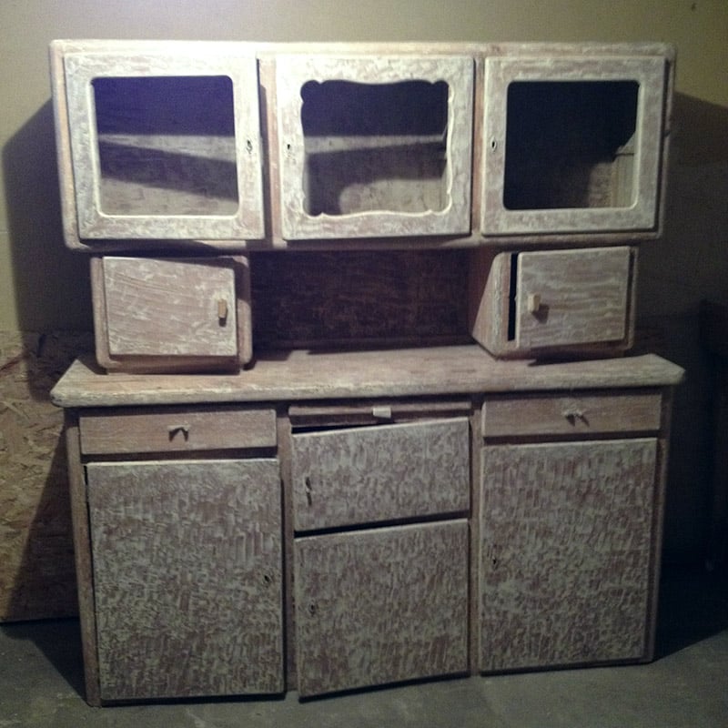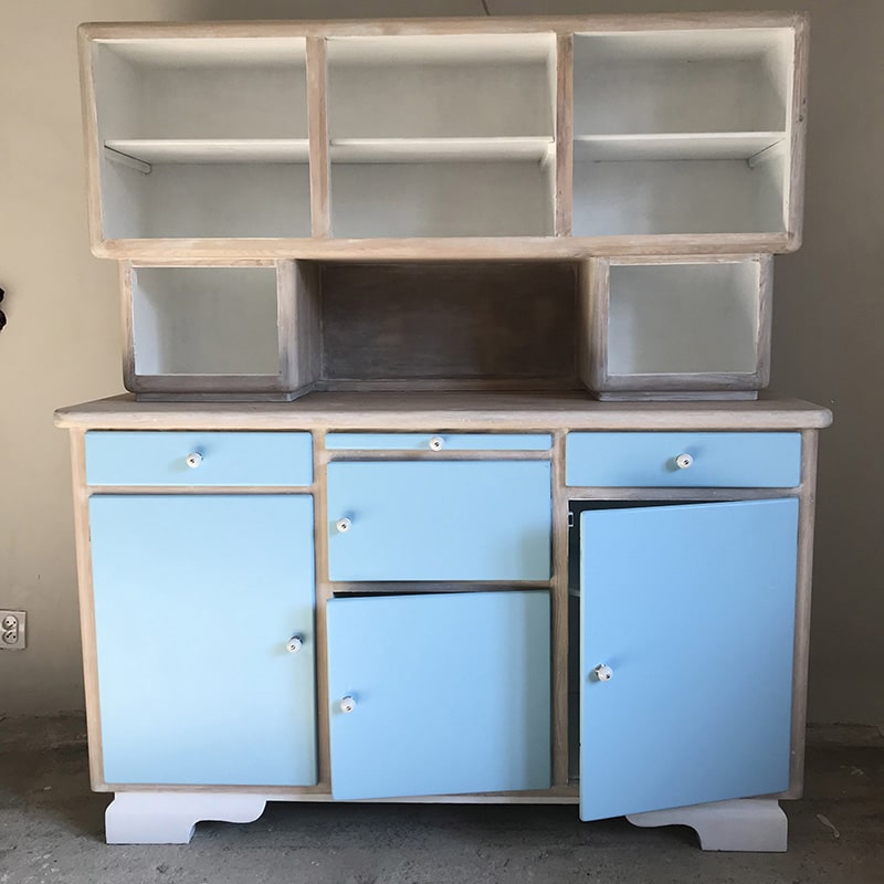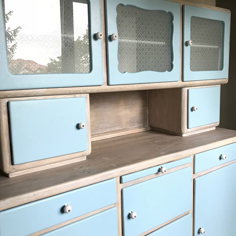 W tym pracochłonnym projekcie połączyłam efekt farby kryjącej oraz bejcy. Szybki zastąpione zostały bardzo dekoracyjnym szkłem muślinowym.