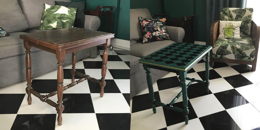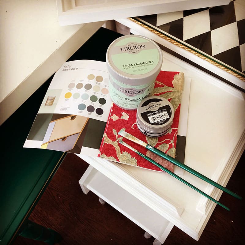 Na zdjęciach widzimy zastosowanie różnych farb: biały stół – farby firmy 3v3, zielony stolik kawowy – farby firmy Ralston i biurko – farba kazeinowa firmy Liberon. Farby Ralston odpowiednią twardość i odporność na ścieranie osiągają po 20 dniach od pomalowania, możemy umieszać każdy kolor z próbnika. Firma Liberon ma gotową propozycje bardzo ładnych kolorów, farby kazeinowe są bardzo matowe, świetnie wyglądają na przedmiotach i meblach dekoracyjnych, są bardzo łatwe w nakładaniu.