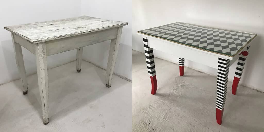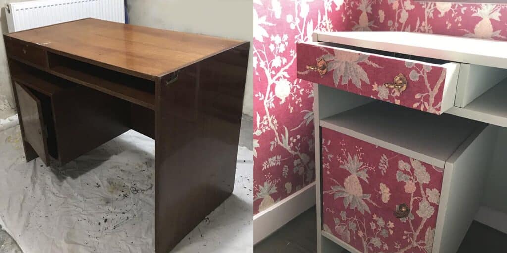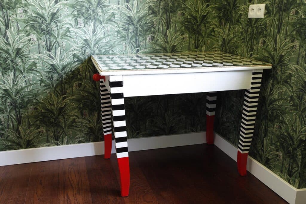 Tak jak pisałam w poprzednim artykule, każdy mebel przed malowaniem należy odtłuścić, możemy go po prostu umyć płynem do mycia naczyń, spłukać i dobrze wysuszyć. Następnie całość malujemy na wybrany kolor. Po nałożeniu odpowiedniej ilości warstw i wysuszeniu – rysujemy ołówkiem wzory, które następnie wypełniamy przy pomocy mniejszego pędzla. Ciekawe efekty uzyskamy również stosując kawałki tapety. Wystarczy zmierzyć dokładnie fragment mebla, na który planujemy nakleić wzór, a następnie odpowiedni kawałek wyciąć z tapety i przykleić klejem np. typu wikol.