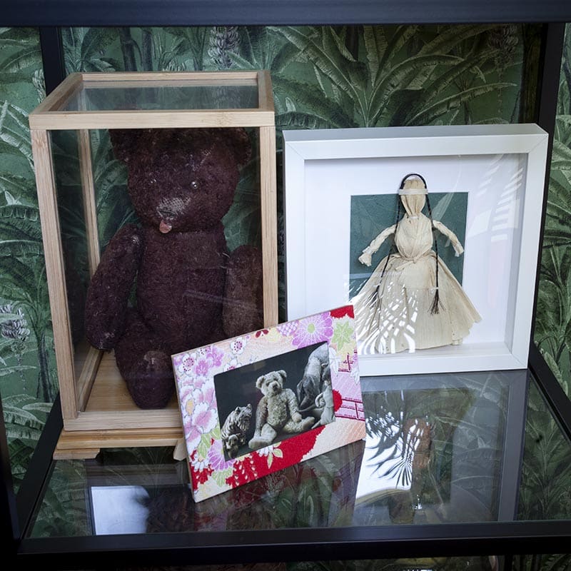 A to moja kolekcja starych zabawek w złotej skrzyni.