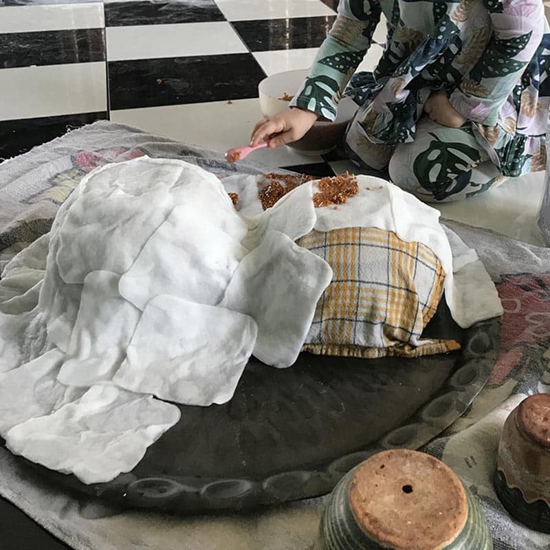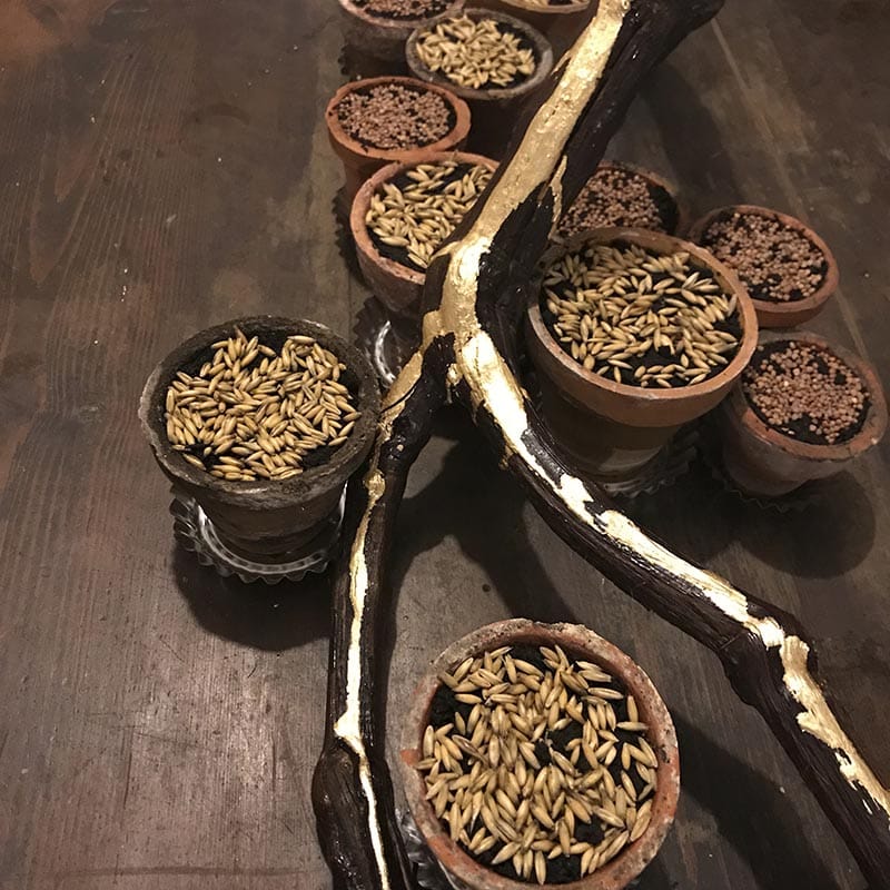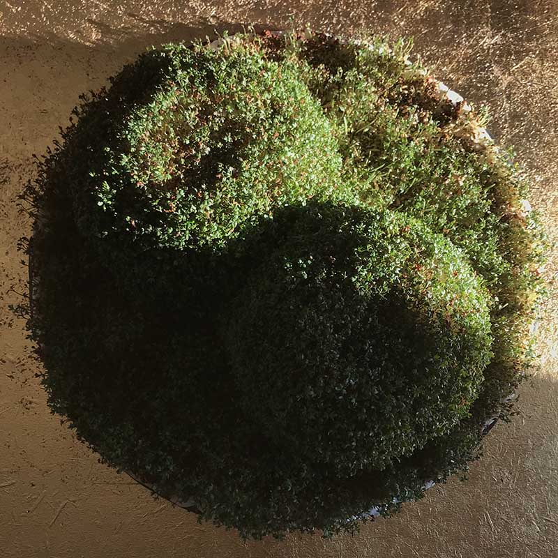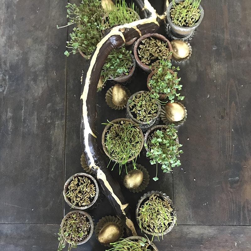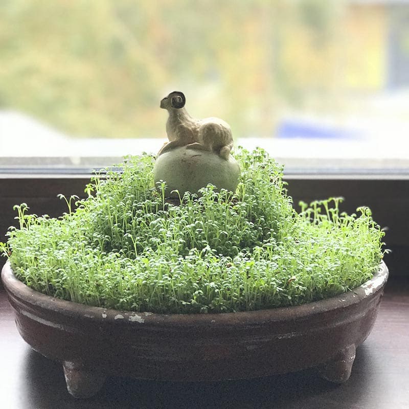 Najważniejszą rzeczą przy tworzeniu zielonych wzgórz jest namoczenie nasion w ciepłej wodzie na min. 1 godzinę. Bazą do stworzenia kompozycji jest taca, musimy pamiętać, że będziemy podlewać naszą rzeżuchę, dlatego tak ważna jest odpowiednia podstawa. Następnie układamy doniczki lub inne pojemniki, które nadadzą nam odpowiedni kształt. Ceramiczne doniczki świetnie się sprawdzają ponieważ chłoną wilgoć. Całość okrywamy namoczonymi wacikami lub np. lnianym płótnem, można zastosować płótno na waciki. Na tak przygotowaną formę nakładamy nasiona. Dzięki wcześniejszemu namoczeniu łatwo przykleić je do pionowych powierzchni.