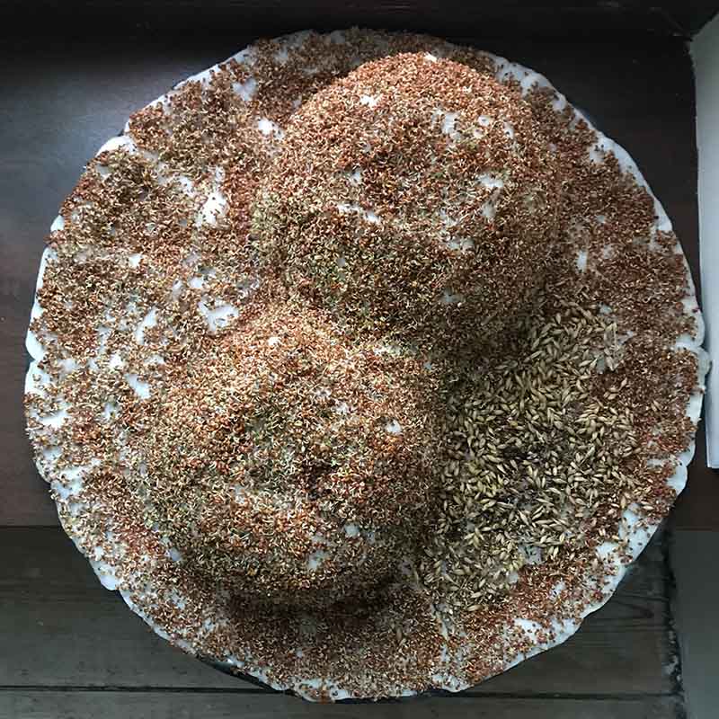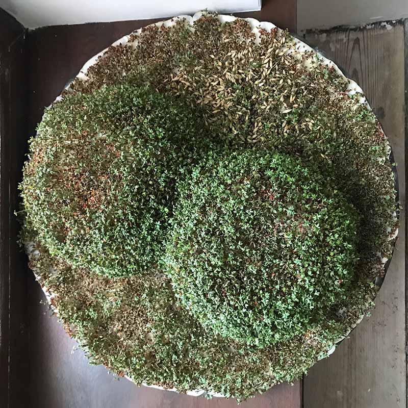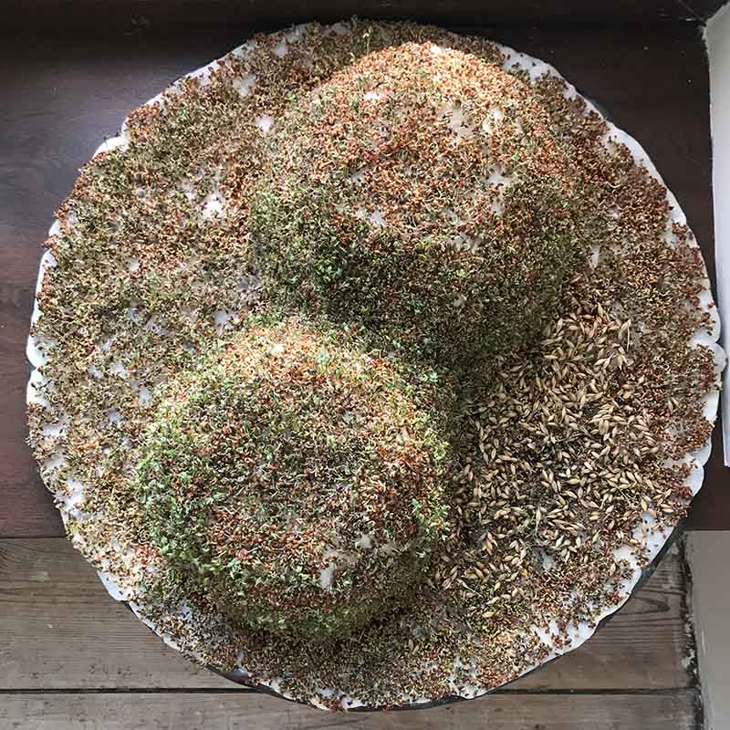 Oto przykłady innych dekoracji z użyciem nasion rzeżuchy, rzodkiewki i pszenicy.