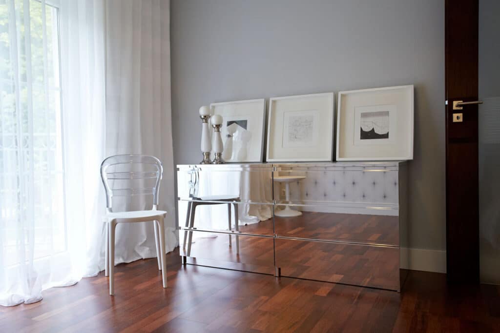 Salon zaaranżowany przez projektantkę Rozalię Świtalską to elegancka, harmonijnie wyważona przestrzeń, w której klasyka spotyka się z nowoczesną lekkością. Drewniane podłogi wprowadzają ciepło i naturalny rytm, a lustrzana szafka dodaje wnętrzu subtelnego blasku i optycznie je powiększa. Do sesji zdjęciowej wypożyczono moje grafiki wykonane w technikach akwaforty i akwatinty – ich precyzyjna kreska i miękkie przejścia tonalne wprowadzają do aranżacji nutę artystycznej głębi. Całość tworzy spójny, wyrafinowany kadr, w którym sztuka i design przenikają się w sposób niewymuszony i elegancki.