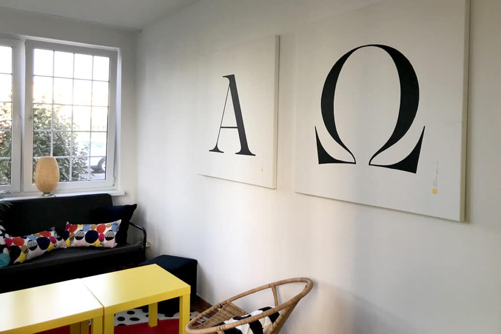 Do katolickiego ducha domu nawiązują również wykonane przeze mnie prace przedstawiające symbole chrześcijańskie: krzyż, ryba, gołębica, oko opatrzności oraz alfa i omega (akryl na płótnie, format 90/90 cm).