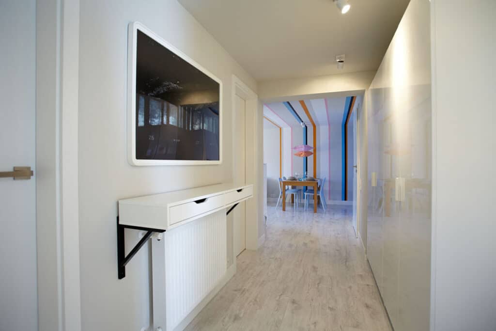 W korytarzu uwagę przyciąga serigrafia – mocniejsza w wyrazie, graficzna, dodająca przestrzeni charakteru i rytmu. Zestawienie akwarelowej delikatności z wyrazistą formą sitodruku tworzy pełną dynamiki opowieść o kolorze, ruchu i nowoczesnej wrażliwości. Dzięki temu połączeniu mieszkanie nabiera indywidualnego stylu, a sztuka staje się integralnym elementem codziennego życia domowników.