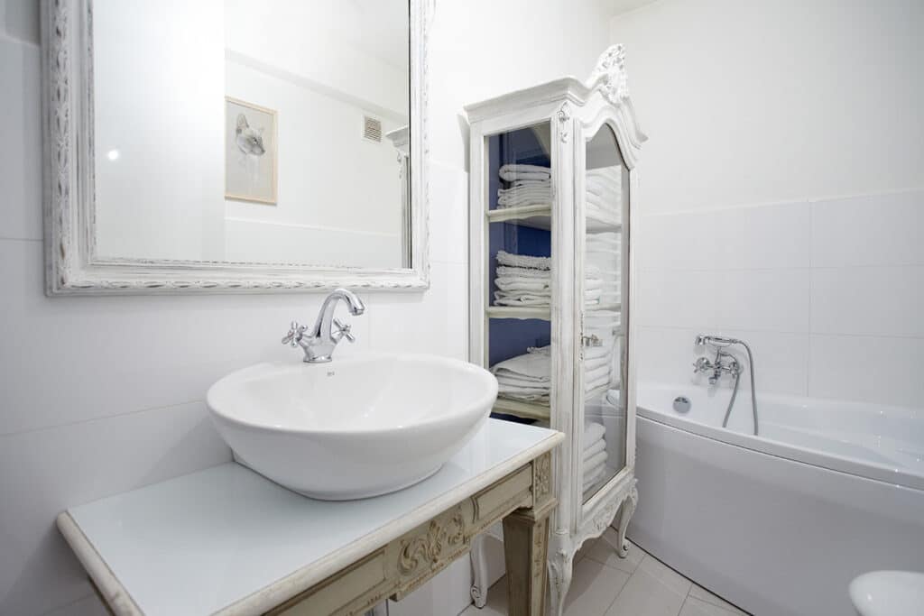 Biały salon w stylu shabby chic z błękitnym pejzażem