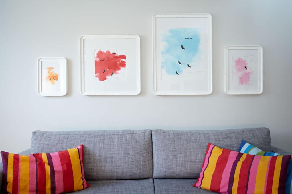 To pełne życia, barwne mieszkanie zaprojektowane przez Rozalię Świtalską stanowi idealną scenę dla moich ilustracji wykonanych tuszem i akwarelą. Delikatne ptaszki o subtelnym rysunku i miękkich przejściach kolorów wprowadzają do wnętrza lekkość oraz odrobinę poetyckości. Ich naturalny wdzięk pięknie współgra z energetyczną paletą mieszkania, podkreślając jego drobne detale i tworząc atmosferę kreatywnej radości.