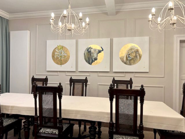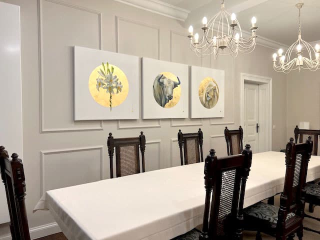 Obrazy z cyklu Ewangeliści zostały wyeksponowane w jadalni i salonie plebanii w Czerlejnie – w przestrzeniach, które łączą historyczny charakter budynku z subtelnie odświeżoną estetyką.