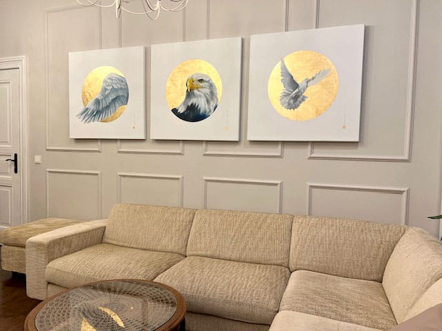 Obrazy z cyklu „Stany emocjonalne”, do którego należy ten dyptyk, cieszą się dużą popularnością i trafiły już do wielu domów. To seria oparta na ekspresyjnych plamach rozlanej farby oraz realistycznych ptakach zrywających się do lotu – połączeniu, które oddaje ulotność emocji i wewnętrzny dynamizm. Każda praca z tego cyklu staje się w domu mocnym akcentem, który przyciąga wzrok i wprowadza do wnętrza energię oraz symbolikę wolności.