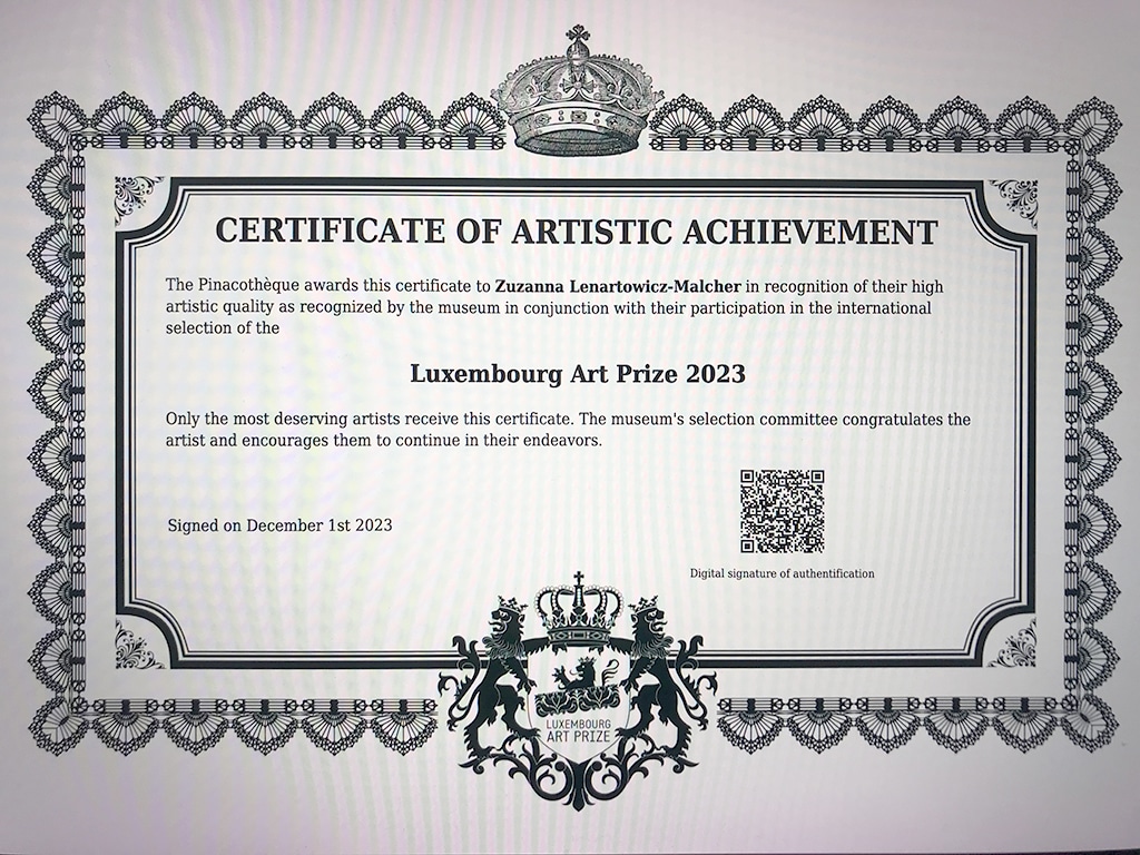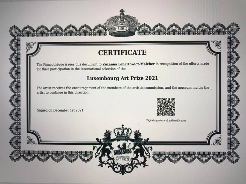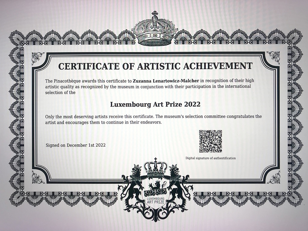 W tym roku w konkursie wzięło udział 639 artystów. Zwyciężyło trzech, natomiast ,,wszystkim artystom, którzy wyróżnili się jakościowo, niezależnie od tego, czy są finalistami, czy nie, Muzeum wydało dyplom za rok uczestnictwa. Celem certyfikatu jest oficjalne wyróżnienie przez Muzeum artystów, których zasługi i talent artystyczny zostały w sposób szczególny zauważone’’. Utrzymałam certyfikat w kolejnych latach 2022 i 2023.