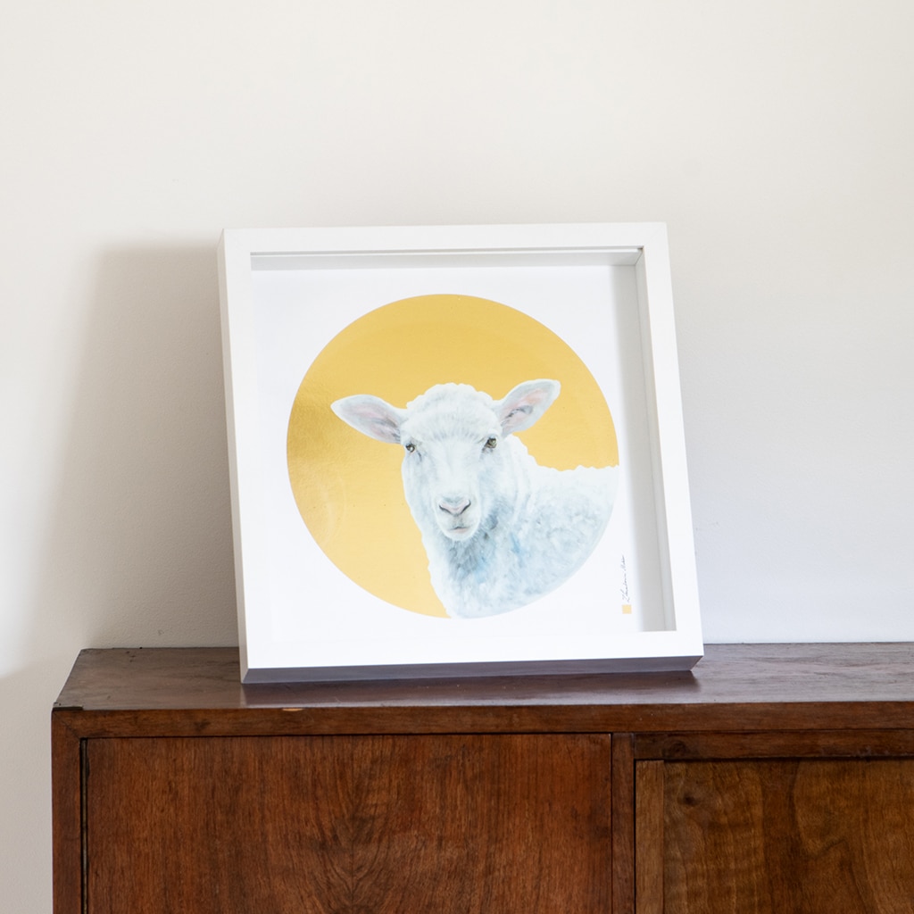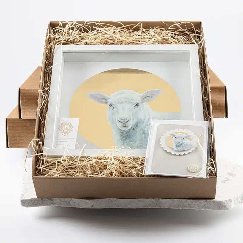Delikatna, symboliczna i pełna światła reprodukcja obrazu olejnego przedstawiającego baranka – klasyczny symbol Chrystusa („Agnus Dei”). Kompozycja nawiązuje do ikonografii chrześcijańskiej i tradycji malarstwa sakralnego, zachowując jednocześnie współczesny, minimalistyczny charakter.