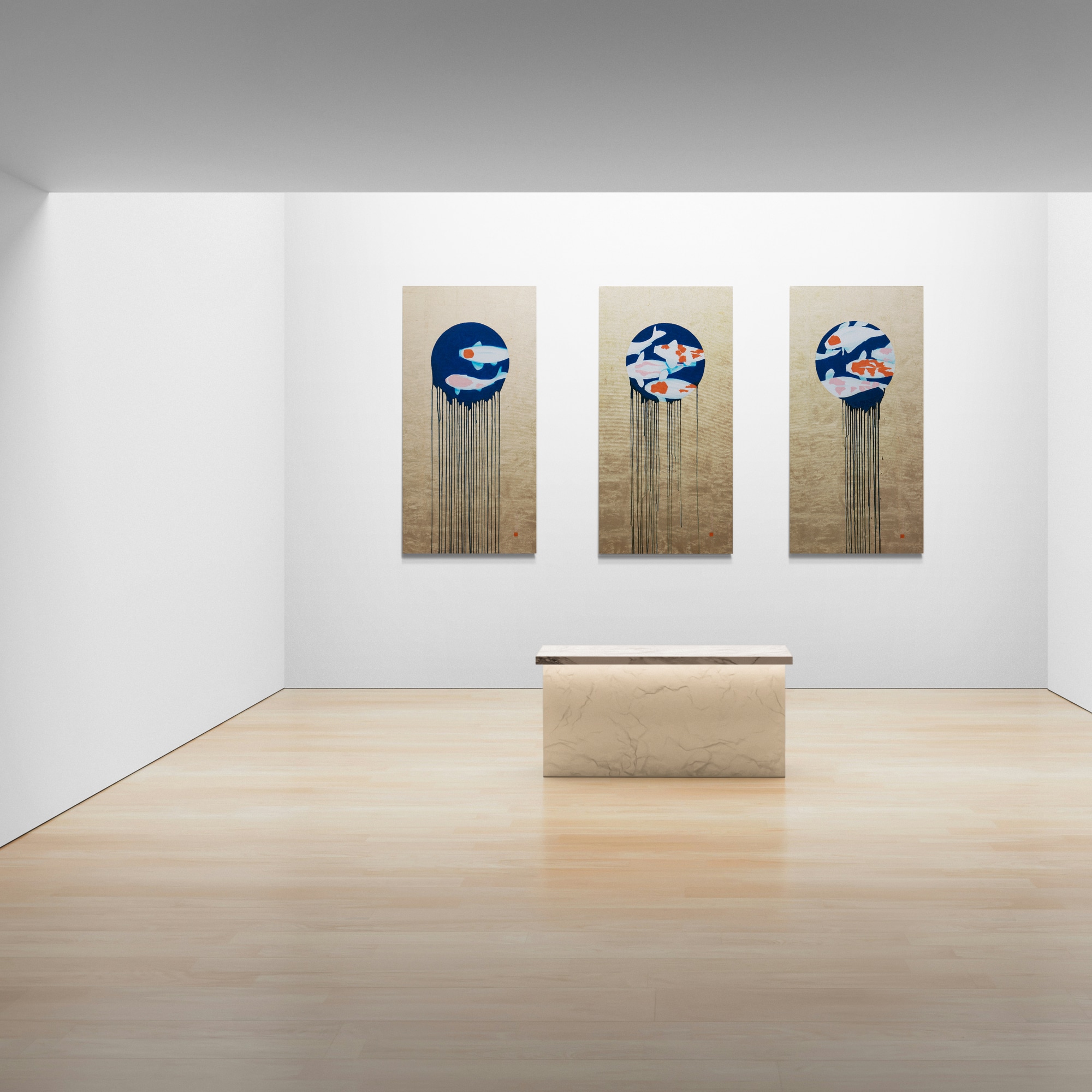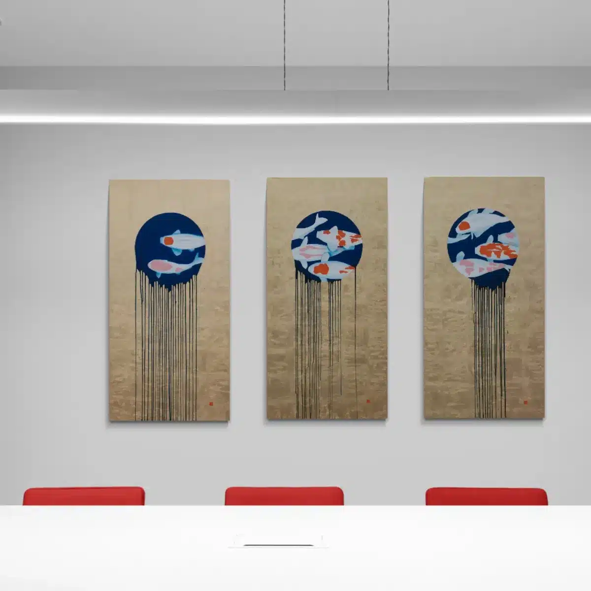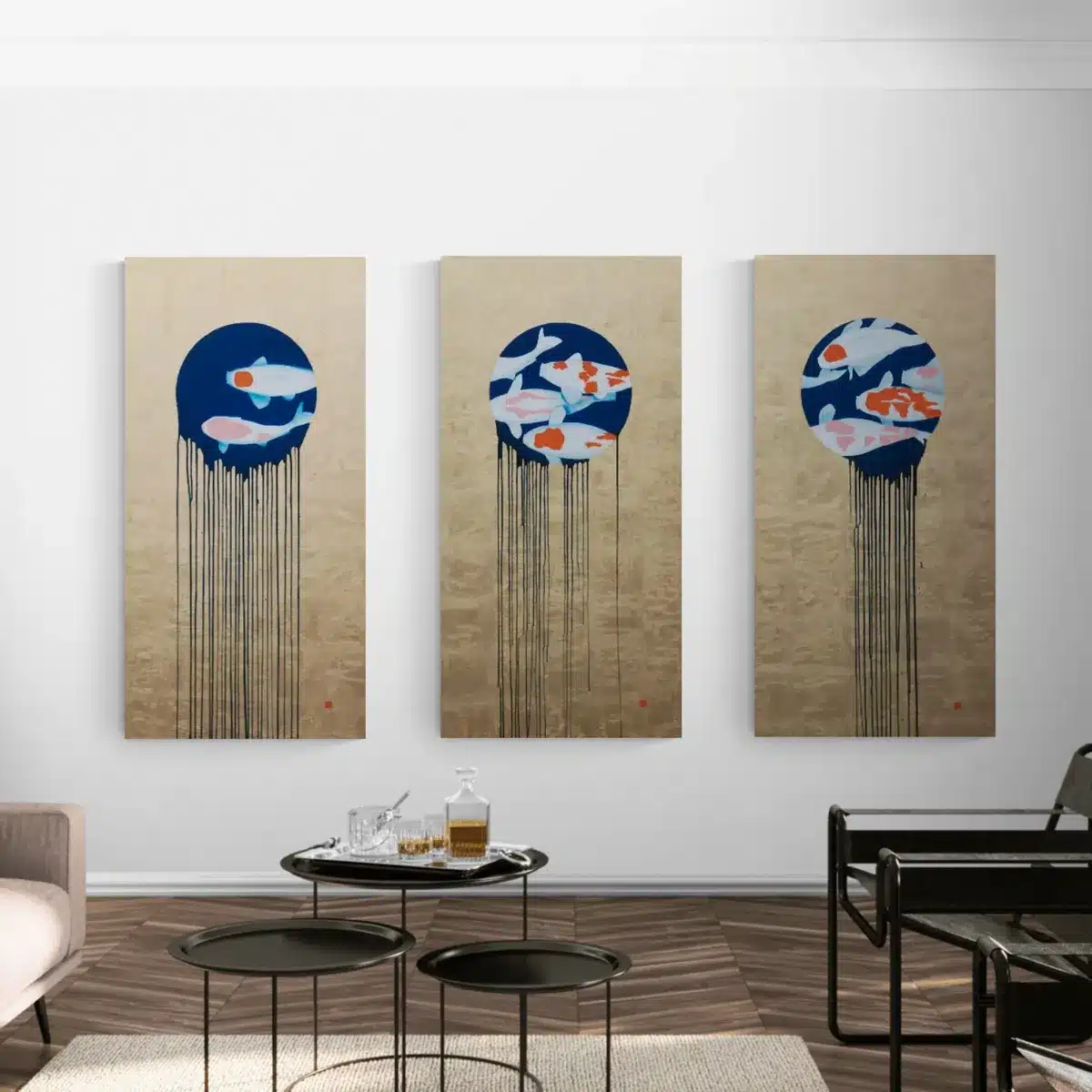 Tryptyk przedstawiający koi – ryby-symboly pomyślności, wytrwałości i harmonii – zanurzone w złotej przestrzeni ciszy. Różowo-pomarańczowe sylwetki ryb suną leniwie w bezkresnym stawie odbić, zredukowanym do błękitnych owalnych form, z których opadają pasma „wody” malowane z matematyczną precyzją.