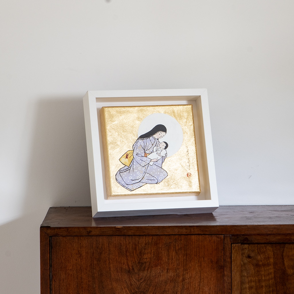 „Tokijska Madonna na złotym tle” to oryginalny obraz olejny 20 x 20 cm w ramce 25 x 25 cm. Połączenie szlagmetalu i japońskiego papieru nadaje mu wyjątkowy charakter. Inspirowany tradycyjnymi przedstawieniami Maryi z Dzieciątkiem w estetyce japońskiej. Idealny prezent na ślub, narodziny dziecka lub Dzień Matki.