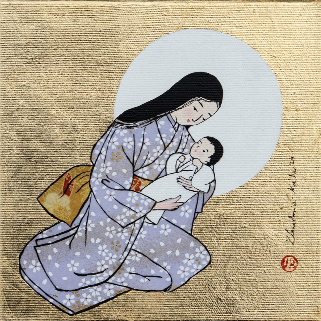 „Tokijska Madonna na złotym tle” to wyjątkowy obraz, łączący olej na płótnie, szlagmetal oraz ręcznie wklejane elementy z japońskiego papieru. Kompozycja inspirowana jest rzadkimi przedstawieniami Maryi z Dzieciątkiem Jezus w tradycji japońskiej, co nadaje jej subtelny i unikatowy charakter.
