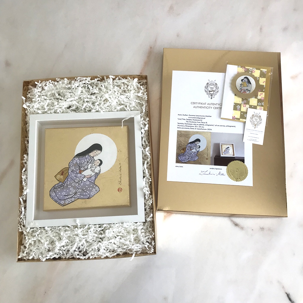 Praca zapakowana jest w eleganckie złote pudełko z certyfikatem autentyczności w języku polskim i angielskim oraz kartką okolicznościową w technice scrapbooking. To doskonały pomysł na prezent ślubny, z okazji narodzin dziecka, na chrzest, komunię lub Dzień Matki. „Tokijskie Madonny” to nie tylko obraz – to ponadczasowa pamiątka i dzieło sztuki, które wzbogaci każde wnętrze.